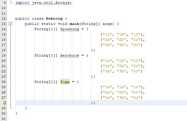 Jo precis, kan inte skriva "1a" t.ex. med int. Är det någon som kan komma med något som kan hjälpa mig lite på vägen? Förstår inte hur jag ska tilldela t.ex Yoga[0][0] alltså "1a" till bokad eller ej bokad.