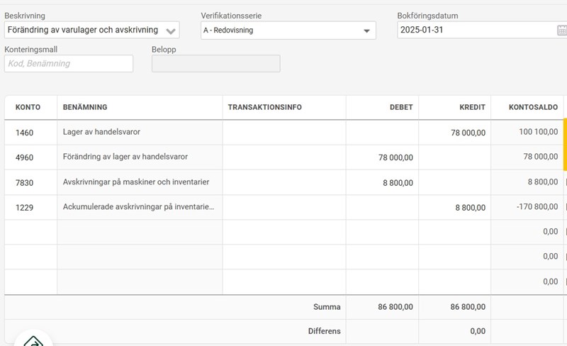 Jag blev jätteosäker när jag satt med bokslutet på en uppgift. Jag har gjort 14 verifikationer och är nu på sista, bokslutet där jag ska skapa en verifikation om att varulagret har minskat med 78 000 kronor och avskrivning på 8 800 kronor.
