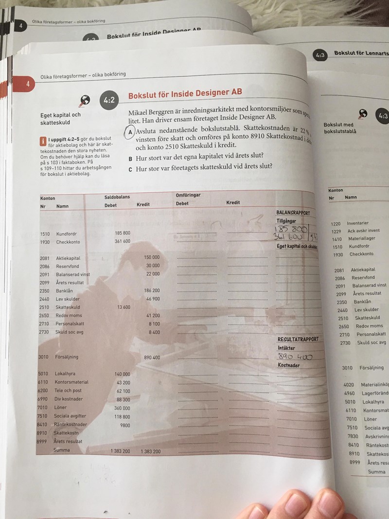 På sida 103 står att ”aktiebolaget måste själva betala inkomstskatt på årets vinst. Skatten är 22% av bolagets beskattningsbara vinst” samt 109-110 står enbart arbetsordning vid bokslut i aktiebolag. Det står inte ett exempel som jag kan följa efter så drf förstår jag inte på vad ska jag titta, jag har facit till denna uppgift men vill just veta om det finns ett mall att följa ? Liksom ”...+...+...x0.22= skatteskuld/skattekostnad ”