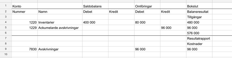 a) När året började hade företaget inventarier anskaffade föregående år för 400 000 kr. Under året har man anskaffat nya inventarier för 80 000 kr. Inventarierna skrivs av med 20 % av anskaffningsvärdet.