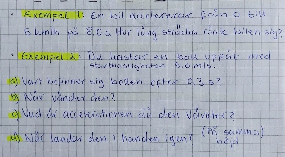 Hej! Jag lyckades lösa exempeluppgift 1 och fick 20 m som svar. I exempeluppgift 2 a) fick jag 1,1 m uppåt som svar. Jag undrar ifall dessa svar är rätt då facit saknas. Undrar dessutom hur jag går till väga för att lösa b) c) och d). Hunnit tyvärr glömma en hel del kinematik. Tack på förhand!