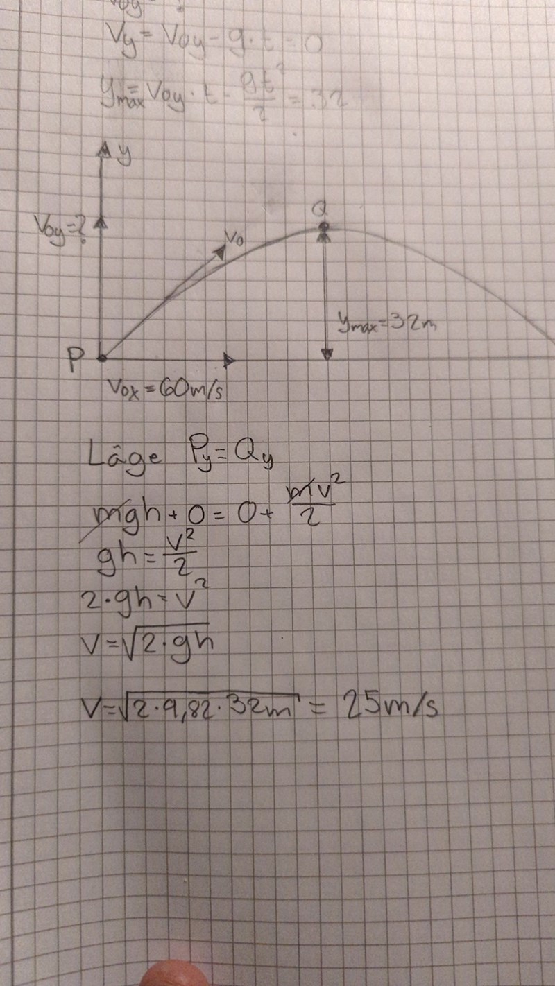 Du vet hur mycket bollen har ökat sin potentiella energi när den når maxpunkten. Eftersom den totala mekaniska energin är konstant så måste den ha minskat sin kinetiska energi precis lika mycket.