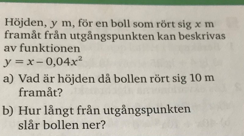 Är du med på att i funktionen står för antalet meter som bollen har rört sig framåt, och att är höjden efter ett visst antal meter framåt? I a) frågar de efter hur många meter upp i luften, alltså , bollen är efter 10 meter. Då sätter vi in 10 istället för och ser vad höjden är.