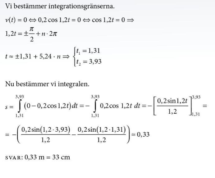 Jag tycker att facits lösning är onödigt krånglig. Ta fram antiderivatan till v(t). Koefficienten framför sin-uttrycket motsvarar amplituden, vilket är det maximala utslaget i svängningen. Avståndet mellan vändlägena är alltså två amplituder och således dubbelt så stort som koefficienten.