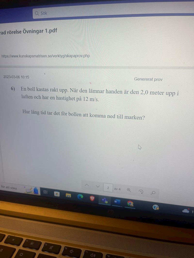 Jag lägger in det i formel men får inte rätt svar. 2=12t-9.82*t'2/2 svar blir 2.6 jag använde pq formel t=6/4.91+-√6'2/4.91'2-2/4.91