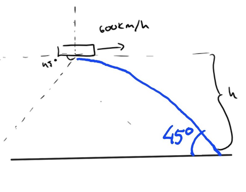 ett bombplan som flyger horisontellt med en hastighet av 600 km/h fäller en bomb. Denna träffar marken under 45 grader. Beräkna planets höjd i det ögonblick bomben fälls.