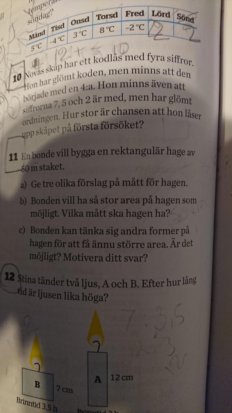 På b) Så är det inte korrekt, Om vi kallar en sida för så blir den andra sidan . Då kan vi uttrycka en area funktion för rektangels area: . Du har inte lärt dig derivata eller pq-formeln antar jag så du får testa dig fram vilket som ger den maximala arean.