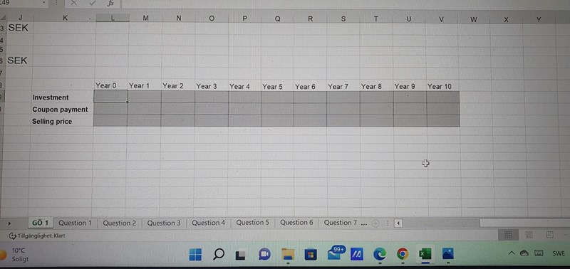 c) Use the table in the answer sheet and indicate the cash flows received from an investment consisting in buying the bond 30 years before its maturity, keeping it for 10 years and selling it right after coupon number 10 is paid (the investment in year 0, the coupon payments and the payment received when we sold the bond at the price computed in item b). Use the values actually paid out those years, not the present value. Also, indicate by using the sign + or – if it was a cash outflow or a cash inflow).