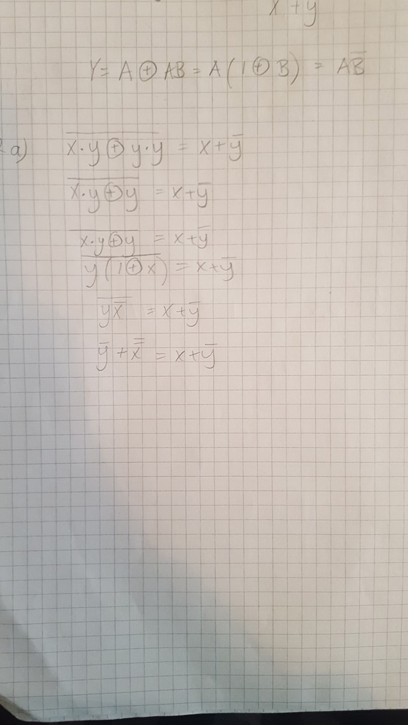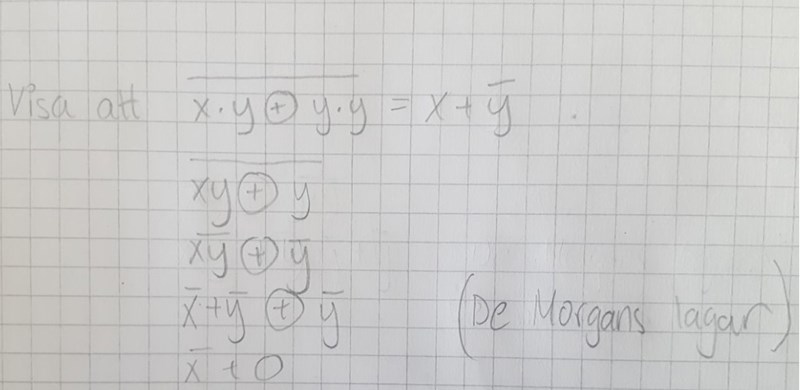 I sista uppgiften kan du först utveckla XOR-uttrycket och sedan använda De Morgans lag och några grundläggande förenklingar tills du kommer fram.