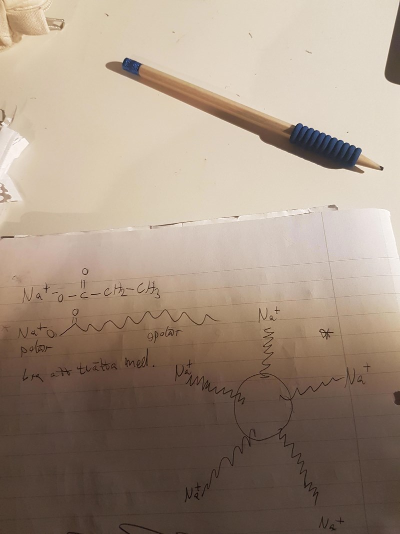 Förstår inte riktigt vad som menas med detta. Ritade av det på lektionen men glömt vad min lärare sa tyvärr... skulle vara glad om någon vet vad det är för ämne som är bra att tvätta med. Antar att det där ämnet är det för att det har en polär och en opolär del så att det löser både polära och opolära ämnen.
