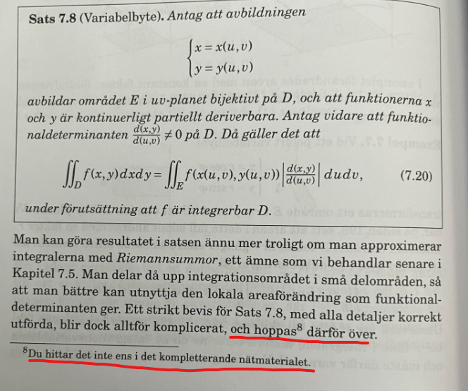 Jag håller på att läsa på om variabelbyten vid dubbel- och trippelintegraler och är lite lätt förtvivlad. Jag försöker förstå varför det är nödvändigt att ta med Jacobianen vid koordinattransformationer och i princip alla källor jag hittar erbjuder bara heuristiska förklaringar som jag har svårt att förstå och acceptera. Jag tror att mitt liv hade blivit enklare om jag hittade ett bevis för varför denna är nödvändig. I jakt på ett sådant kollade jag i min kursbok och blev tyvärr väldigt besviken: