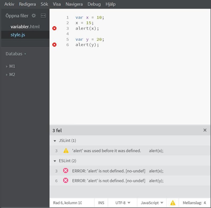 Jag vet inte svaret, men jag hittade den här sidan som verkar handla om ditt problem: https://stackoverflow.com/questions/42104164/jslint-confusion-in-javascript-alerts-are-not-declared