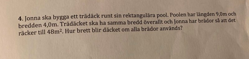 Brädornas area=(area av pool och trädäck) - (poolens area)