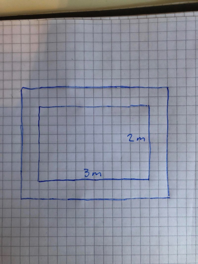 Runt ett rektangulärt fönster som är 2 gånger 3 meter ska det målas en vit ram. Färgburken som du köpt räcker till 4m^2