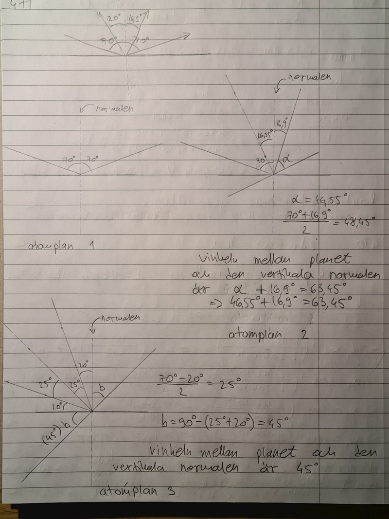 Men skulle man kunna uttrycka att för atomplan 2 är även riktningen (70° + 46,55°)= 116,55° mellan planet och den vertikala normalen om man räknar från andra hållet?