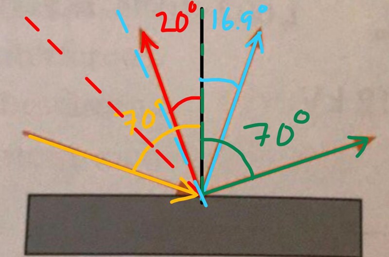 Har fortfarande svårt med att förstå varför man ska göra 70-v? Om vi tänker infalls är 70 så borde reflektionsvinkel bli 70, och därmed borde man lägga till något till 16.5 så att det blir 70.