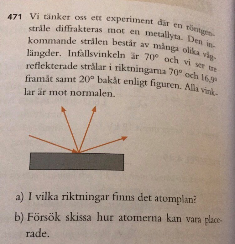 Om infallsvinkeln är 70° och utgående stråle är 16.9° framåt så ska normalen till atomplanet ligga mittemellan dessa strålar. Det ger