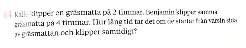 På en timme klipper Kalle 1/2 av gräsmattan, och Benjamin 1/4 på en timme. Alltså har de klippt 3/4 på en timme. Sen då?
