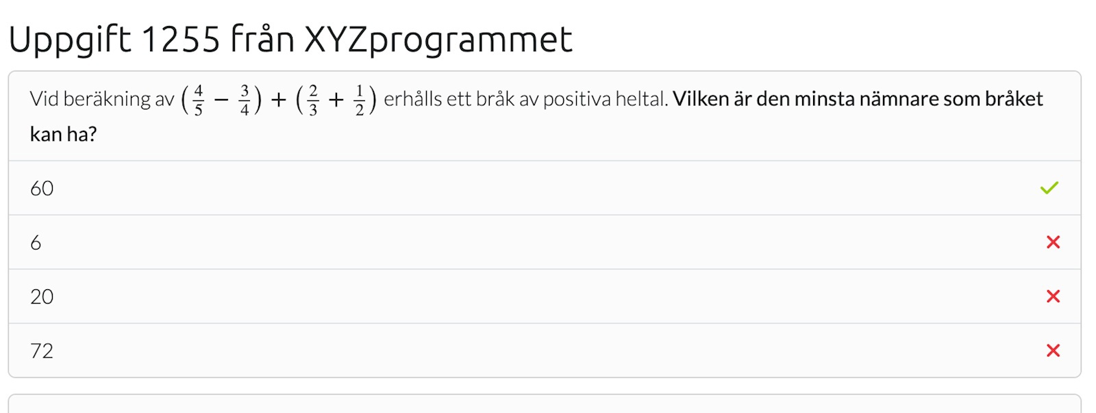 Jag fick rätt svar men i facit står det att det ska bli 73/60 och jag fick 53/60.