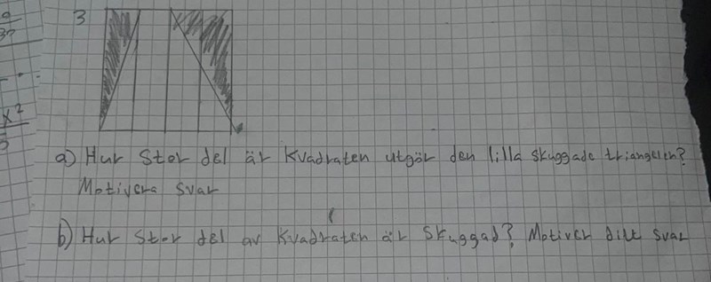 Jag antar att sidan på kvadraten är 1 enhet, så kvadratens totala area är 1 kvadrat-enhet. Den skuggade triangeln är en rätvinklig triangel. Jag antar att basen och höjden är hälften av kvadratens sida, vilket är 0,5 enheter.