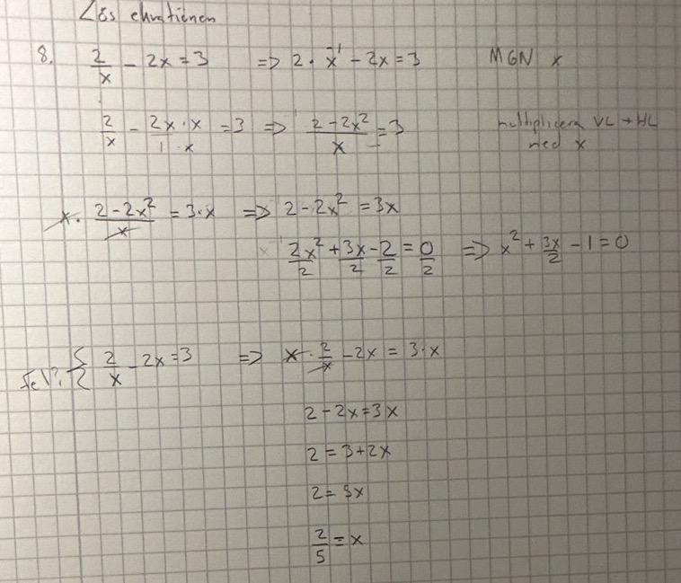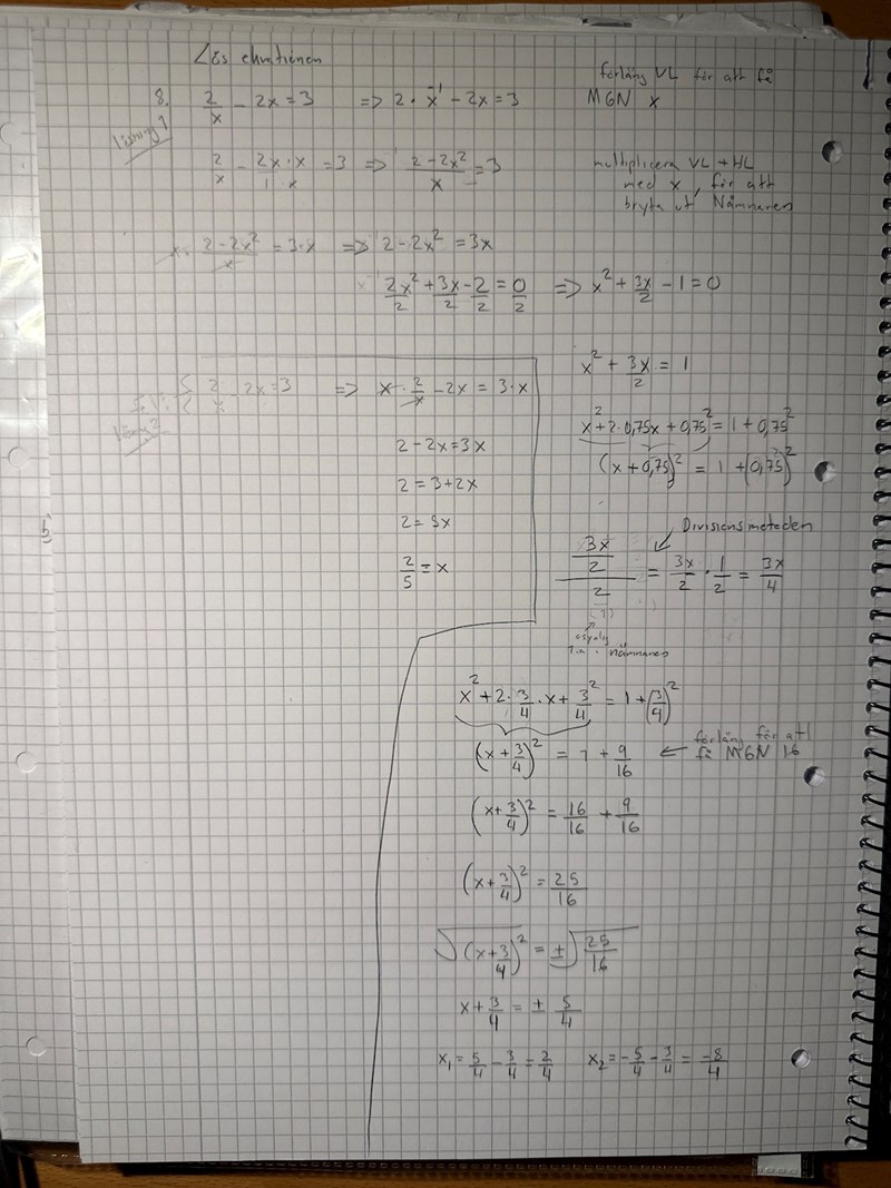 Den här delen är rätt, fast du hade kunnat multiplicera alla termer med x på en gång, utan att först sätta vänsterledet på gemensamt bråkstreck  Du kan fortsätta med kvadratkomplettering eller pq-formeln: