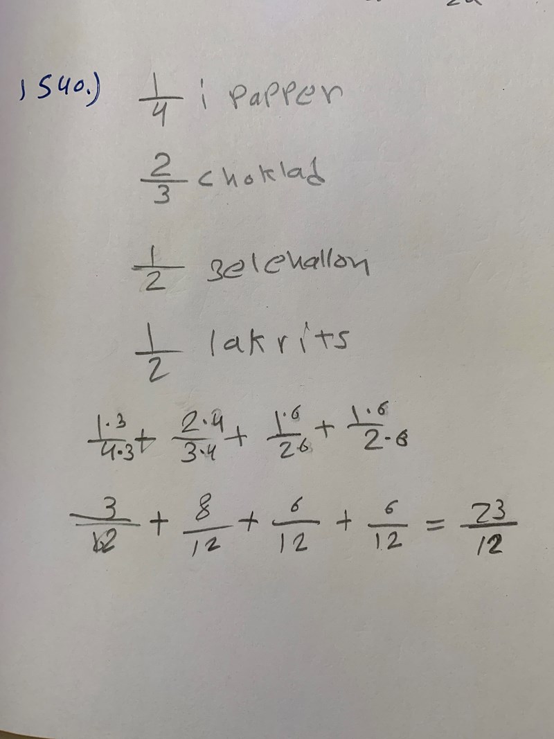 I en godispåse ligger en fjärdedel av bitarna inlagda i papper. Av resten är 2-tredjedelar choklad. Av de övriga bitarna är hälften geléhallon och hälften lakrits. Hur stor del alla bitarna är lakrits?