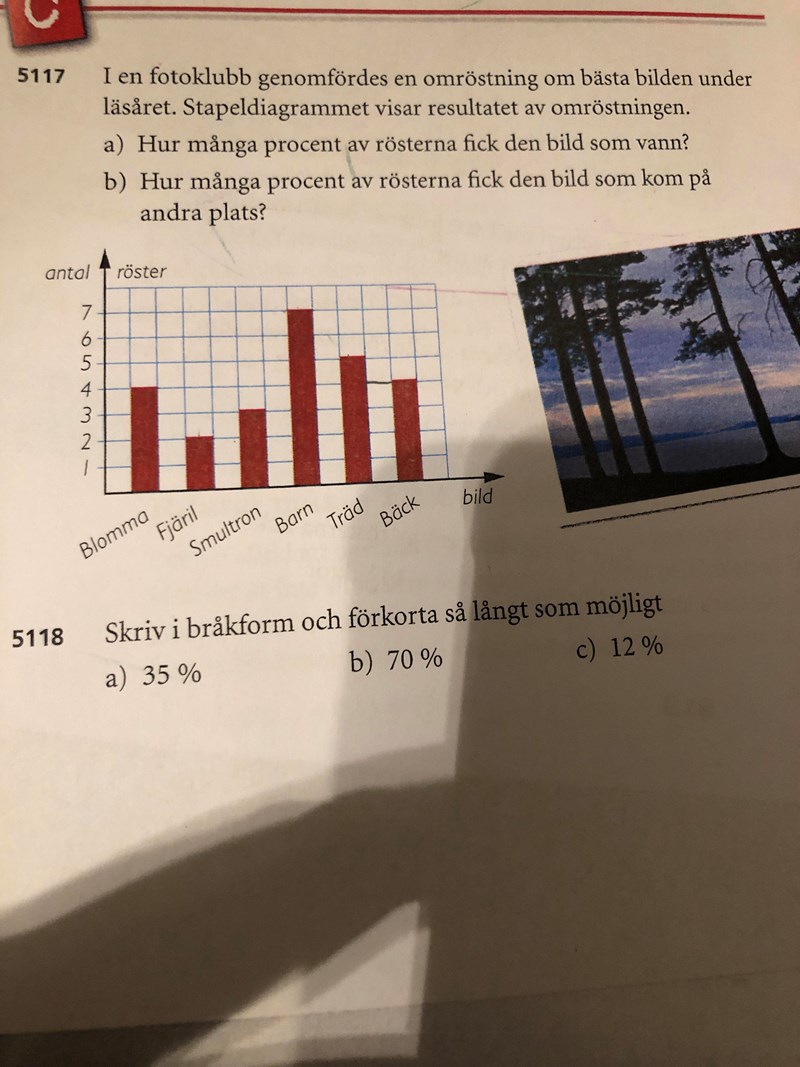 Det är bilden "Barn" som vann. Den fick 7 röster. För att beräkna hur många % av rösterna detta är, måste vi veta hur många röster det var totalt. Det var därför jag frågade