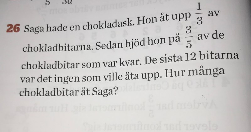 Börja bakifrån. Hon hade 12 bitar kvar på slutet. Det motsvarar 2/5 av de chokladbitar hon inte åt upp. (Då kan du lätt beräkna först hur mycket 1/5 är, och sedan 5/5.) Hur många chokladbitar fanns det kvar när hon började bjuda?