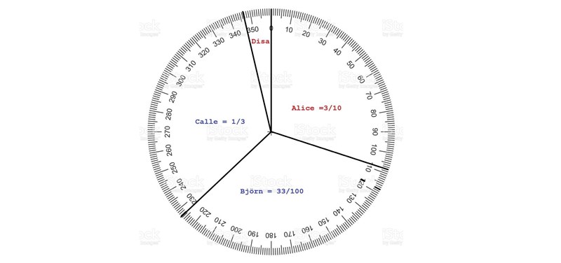 Jag förstår inte riktigt uppgiften, är Alice, Björns och Calles delar 3/10, 33/10 och 1/3?