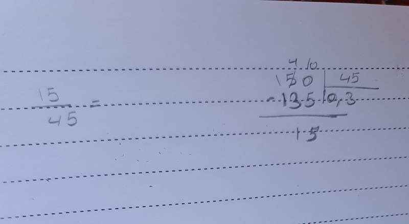 Om du förkortar 15/45 med 5 får du 1/3. !/3 = 0.33333.... :). Visa gärna hur du tänker när du beräknar bråken.