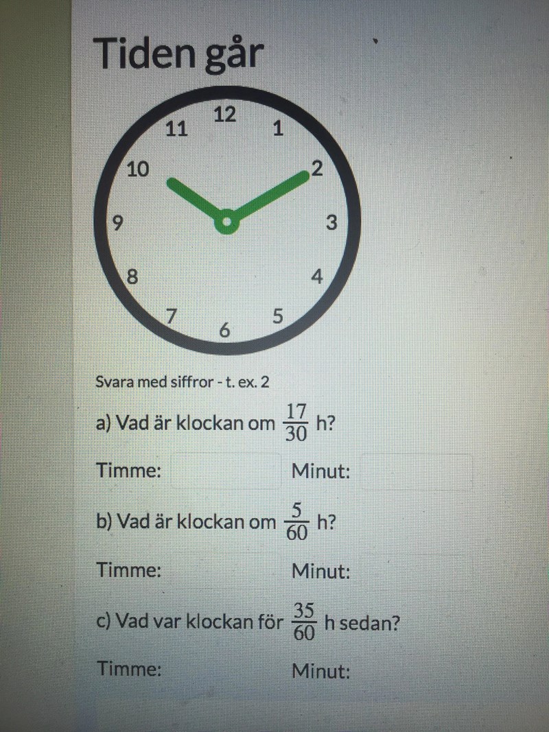 1730·60=1730·30·2=17·2=34 minuter. Vad är klockan när 34 minuter passerat?