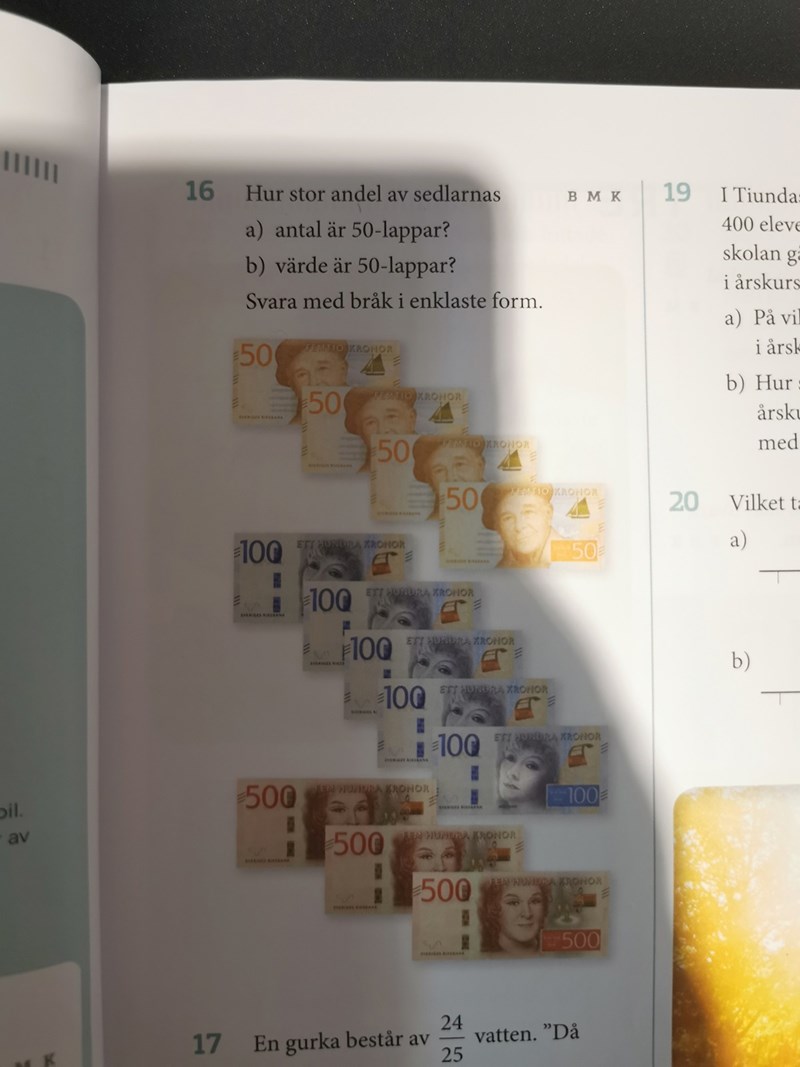 Jag behöver hjälp med att förstå uppgift 16 b. Jag kan att svaret är 1/11 (kollade facist) och jag räknade genom att see hur mycket värde alla 50 lappar har som e 200kr delat på 2200kr (alla pengarnas värde sammanlagt) 2200/200 som blev 11. Då frågade jag min storebror för hjälp och han vände på uttrycket och gjorde istället 200/2200 och jag fattar inte varför (han kan inte heller förklara)