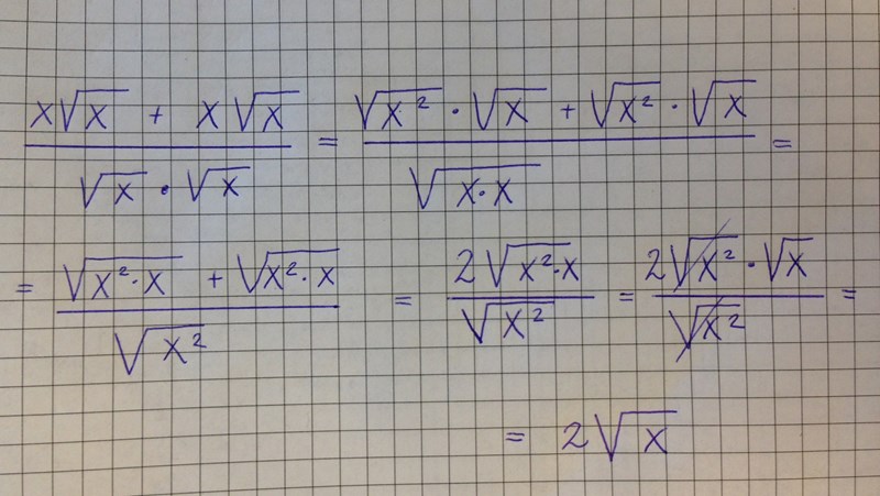 xx+xxxx=2xxx=2x \frac{x\sqrt{x} + x\sqrt{x}}{\sqrt{x}\sqrt{x}} = \frac{2x\sqrt{x}}{x} = 2\sqrt{x}