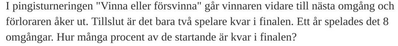 Du vet att 2 är kvar i finalen. När du har räknat ut hur många som var med från början så vet du nog hur du räknar ut procenten.