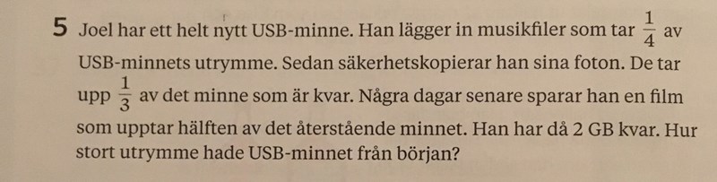 Men i början har han filer som tar 1/4 av utrymmet. 3/4 är kvar! Nu används en 1/3 av det, vilket innebär han använder 1/4 till av det totala. Så 2/4 upptaget och 2/4 kvar. Sedan sparar han en film som tar hälften av det vilket är 1/4. Så har han 2/4-1/4= 1/4 kvar.