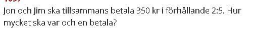 Laguna skrev:Nej, 2:5 betyder att de förhåller sig till varandra som 2 till 5. Någon betalar 2 delar och den andre 5 delar. Hur många delar det är får man addera själv: 2+5 = 7. Så det är 2/7 och 5/7, av 350 kronor.