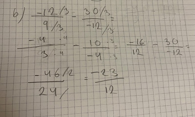 Nej, det är inte -16 -30 = -46. Du räknade först så att de två bråken skulle få gemensam nämnare; för att de ska få gemensam nämnare kan vi inte ha 12 och -12, det måste vara 12 och 12 eller -12 och -12. Då blir det som jag skrev.