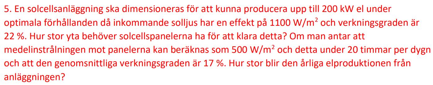 Arean av solcell anläggning är 826,45 m2 i frågan 1. I frågan 2 producerar den cirka 5.1*10^8 Wh el årligen.