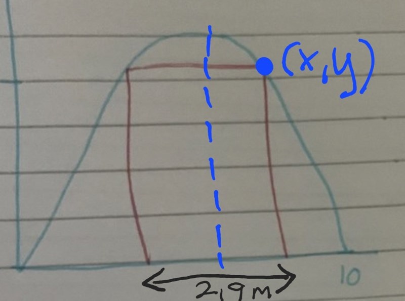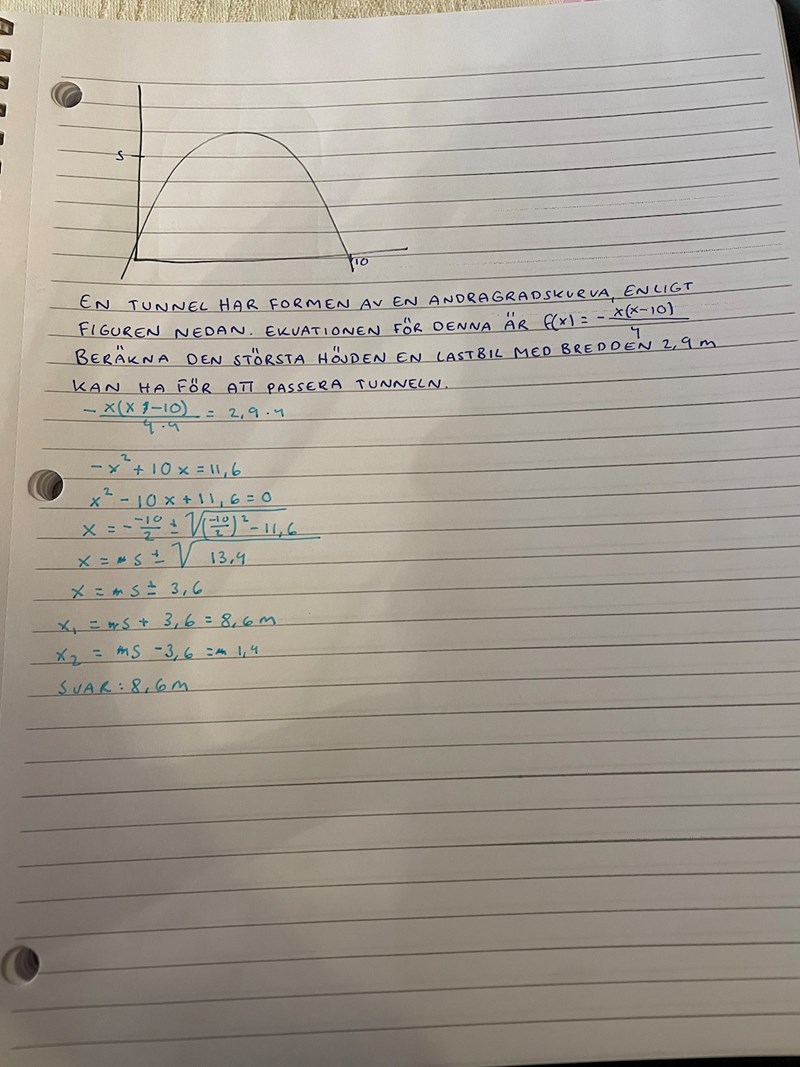 - En punkt (x, y) på parabeln där lastbilen precis når tunneltaket.