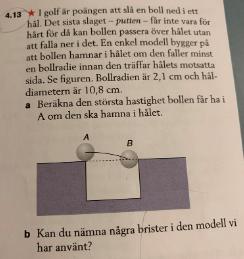 Dessutom verkar det visserligen naturligt men lite godtyckligt att säga att det är när halva bollen är nere i hålet som den ramlar ner helt. Man borde ta reda på hur den studsar för olika hastigheter.
