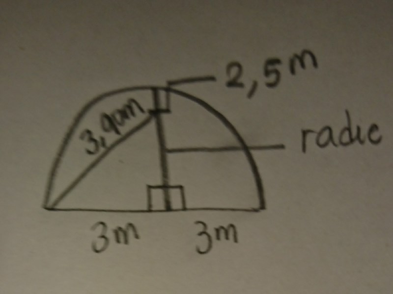 Louis skrev :Bron är 3 m hög där den är som högst. Men vid pråmens sidor (vi antar att pråmen går mitt i broöppningen) är den lägre. Rita in pråmen som en rektangel i halvcirkeln så ser du. Du måste använda Pythagoras sats på en lämplig triangel som du ritar in.