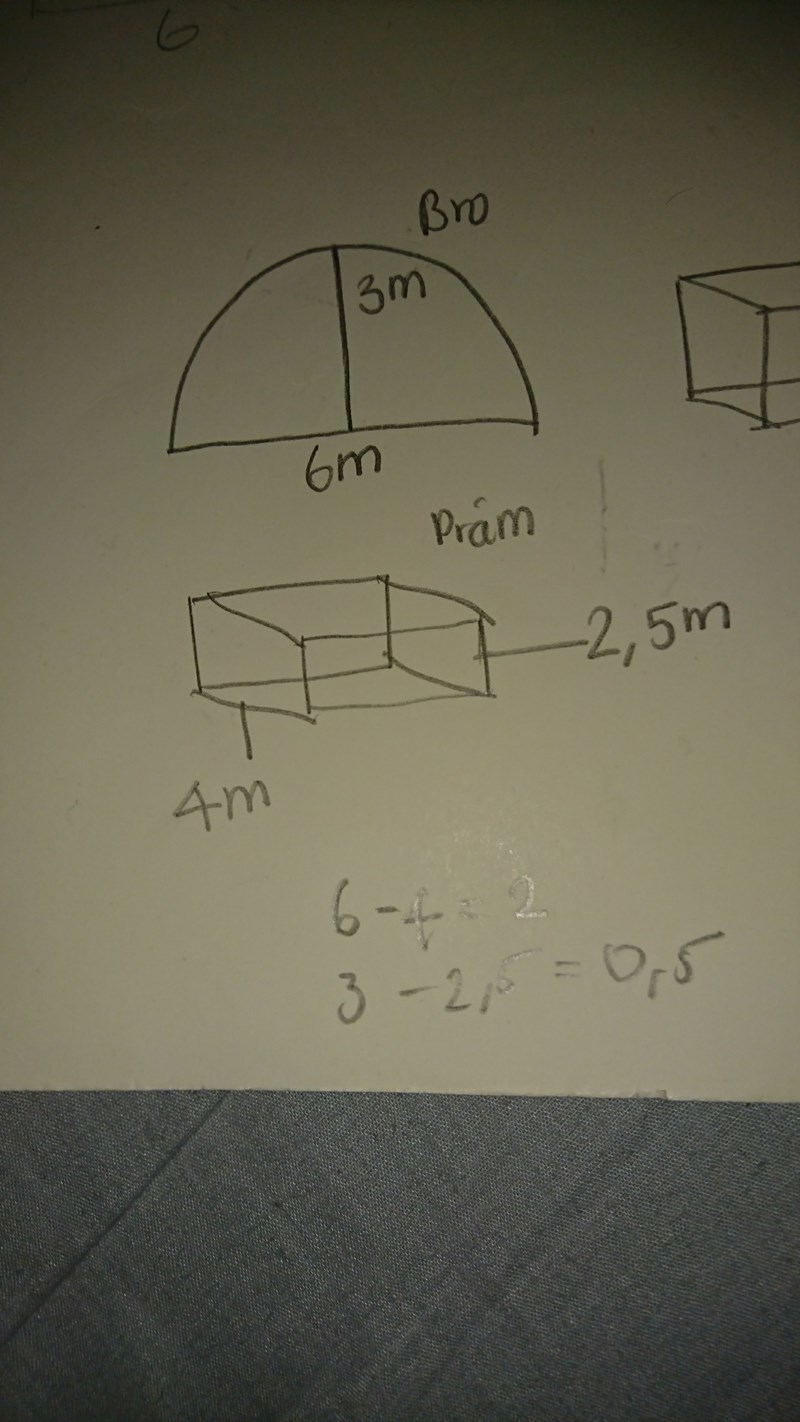 Bron är 3 m hög där den är som högst. Men vid pråmens sidor (vi antar att pråmen går mitt i broöppningen) är den lägre. Rita in pråmen som en rektangel i halvcirkeln så ser du. Du måste använda Pythagoras sats på en lämplig triangel som du ritar in.