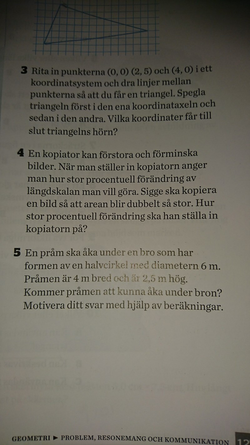 Louis skrev :Det klarar du själv. Gå 2 m höger från cirkelns mittpunkt (halva pråmbredden). Gå 2,5 m upp. Där har du ett hörn på rektangeln som föreställer pråmen sedd fram- eller bakifrån. Likadant på andra sidan. Har du ritat noggrant ser du att pråmen inte får plats. Men ska du bevisa det får du räkna med Pythagoras.