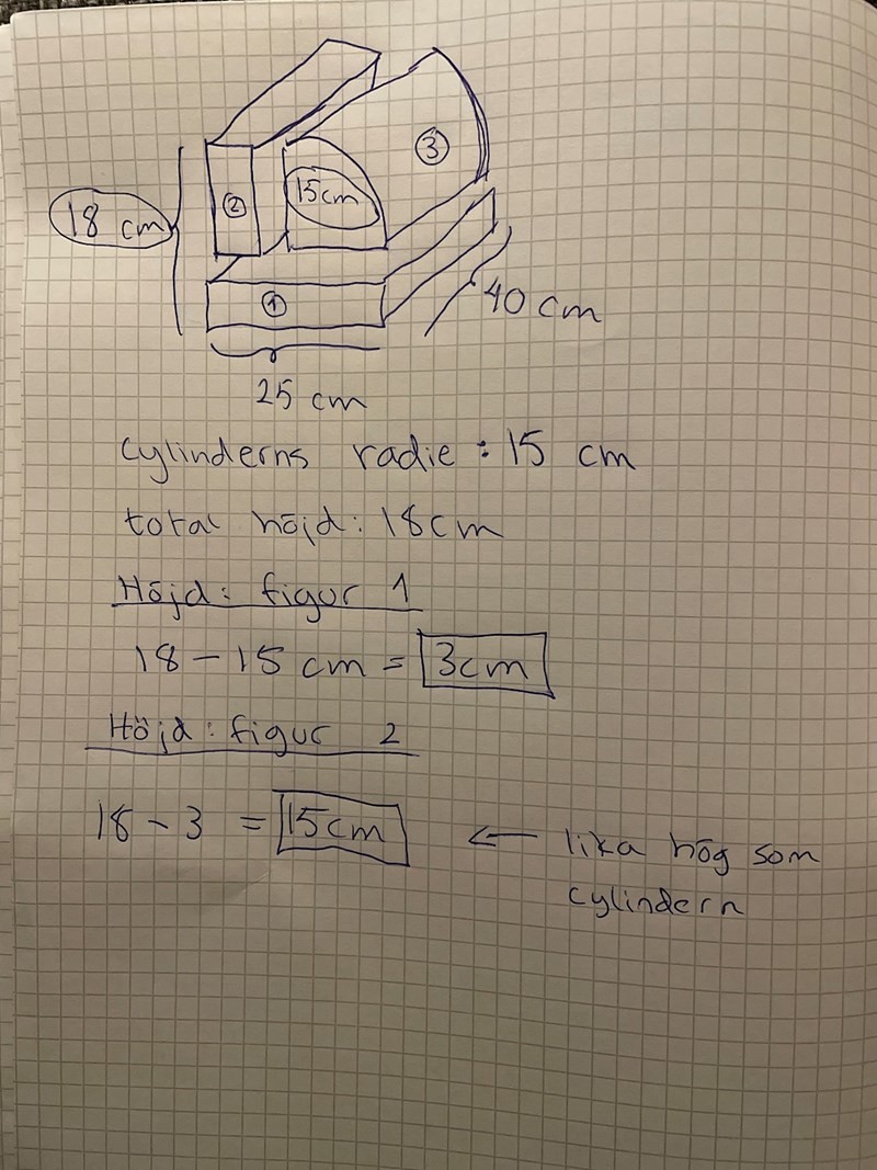 Hej! Jag behöver hjälp med uppgift 33, a. Jag vet att man ska dela upp kroppen i 3 st. delar, såg det på en annan tråd. Men jag förstår inte hur jag räknar ut längden på sidan där det står 18 cm, om man har delat upp i figurer.