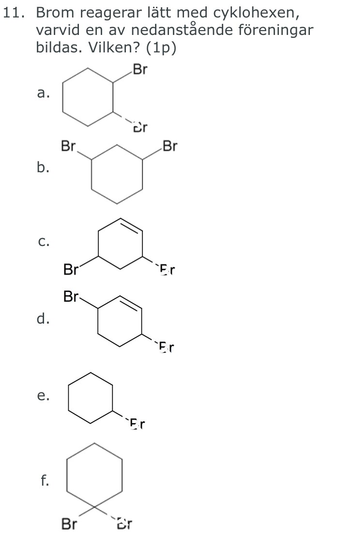 Du måste alltid rita upp dina reaktanter för att försvara valet av din produkt, om det inte krävs i uppgiften så hjälper det dig för att säkerställa att du har tänkt rätt. Rita upp cyclohexen och brom och vid det här laget bör man veta att brom förekommer som Br2 likt alla andra halogener. När du ritar upp dessa så är jag säker på att du kommer på vad svaret är utan extra hjälp. Rita reaktionspilarna så ser du!