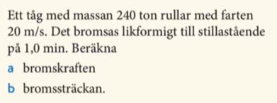 Börja med att räkna ut accelerationen (som är negativ, eftersom tåget bromsas).