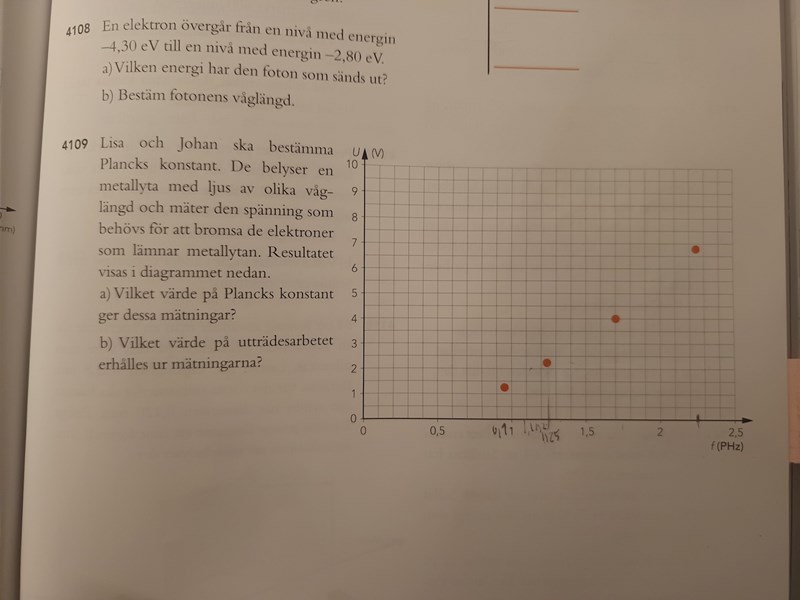 Det jag har gjort är att jag har anpassat en linje med hjälp av all mätdata och får fram k-värdet 4.1015 som motsvarar då h/q. För att få fram h multiplicerar jag 4.1015 med 10^15 (Peta prefix) och 1.602*10^-19. Det ger mig ett fel på flera potenser: 0.00066. Svaret är 6.62*10^-34. Jag förstår inte vad det är jag gör för fel!
