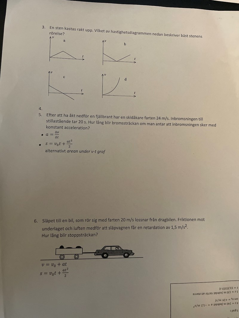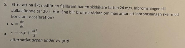 Har svårigheter med en uppgift gällande beräkning av bromssträcka vid konstant acceleration. Hur ska jag tänka? :) (UPG 5) enligt facit blir svaret 130 m