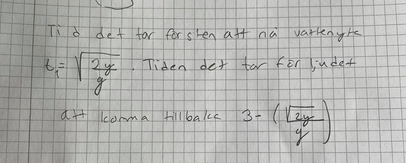 Hur ska jag tänka på följande uppgift? Tänkte använda mig av y= gt^2/2 men vet inte om det är 3,00 s jag ska använda, tänker att hastigheten som den faller ner är väl annorlunda än hastigheten som ljudet färdas på?
