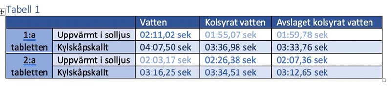 - "Men om vätskan redan innehåller koldioxid, till exempel kolsyrat vatten, kommer det ta längre tid för tabletten att lösa sig" – detta tolkar jag som att tabletten kommer lösa sig snabbare i vatten > avslaget kolsyrat vatten > kolsyrat vatten. Tolkar det även som att när den första tabletten löst sig så innehåller lösningen också mer koldioxid då den bildar koldioxid vid upplösning, så tekniskt sett borde det väl ta längre tid för den andra tabletten att lösa sig av det skälet.